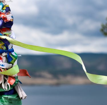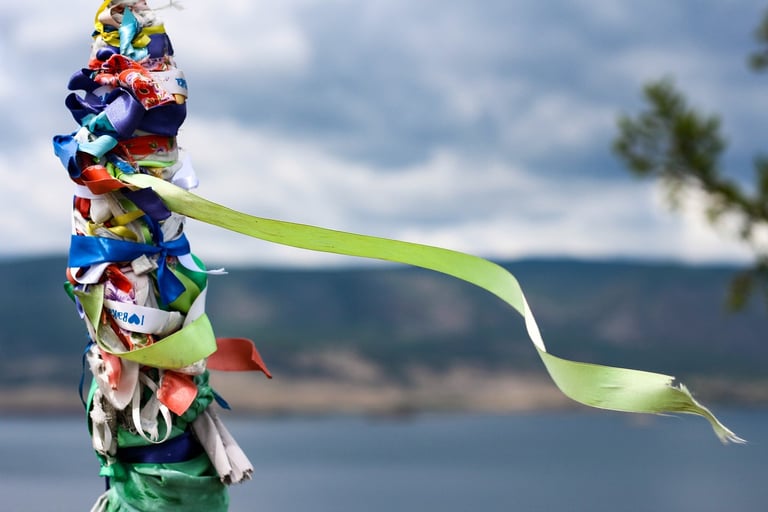 At Lake Baikal, you’ll see shamanic prayer ribbons (khadags) tied to poles and trees. The colours carry meaning: blue for the sky, white for purity and spirit, red for fire and vitality, green for earth and the taiga, and yellow for the sun and prosperity. Locals and visitors tie them as simple offerings – prayers for protection, good health, and harmony with the lake.