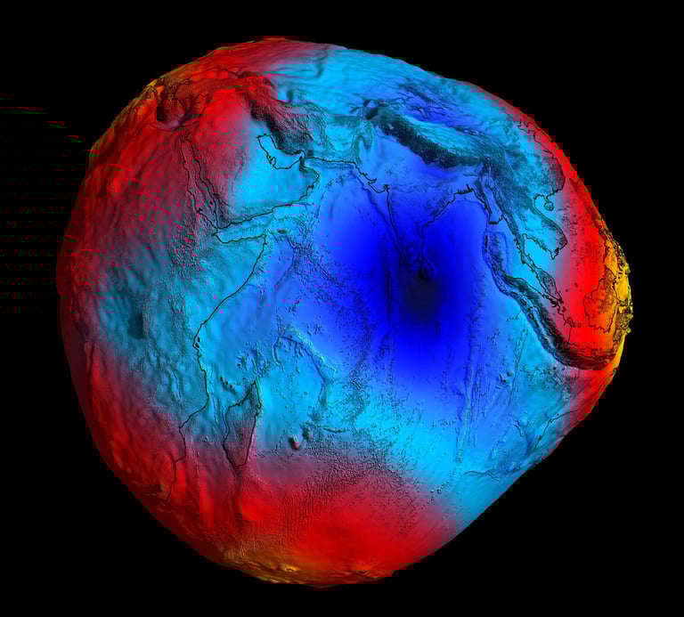 This visualisation highlights the Indian Ocean Geoid Low, indicating a pronounced depression in Earth’s geoid caused by gravity variations