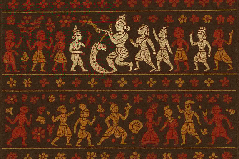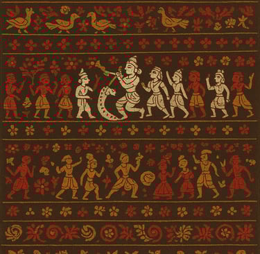The Vrindavani Vashtra, created in 16th-century Assam, is one of the most breathtaking achievements in India’s artistic and spiritual history. It is a vast silk cloth that narrates the childhood and divine exploits of Lord Krishna in Vrindavan. Each scene on it is not just painted, but intricately woven into the very threads of Assam’s legendary silks.