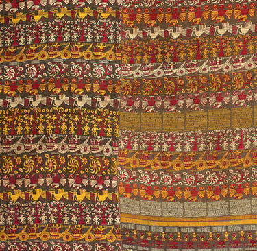Commissioned in the court of the Koch dynasty by Chilarai, brother of King Nara Narayan, the work was entrusted to Mathuradas Burha Aata, a disciple of Sankardeva and master weaver. With a team of twelve artisans and under the saint’s direct guidance, the weavers brought to life a monumental cloth. It was originally more than 180 feet in length, stitched together from multiple strips. Woven between 1567 and 1569, it drew deeply from Assam’s ancient silk tradition, especially the luminous muga and smooth paat silks cultivated in the Brahmaputra valley. Sankardeva’s intervention elevated this regional craft into a sacred art form, placing Assam at the heart of medieval India’s devotional textile culture.